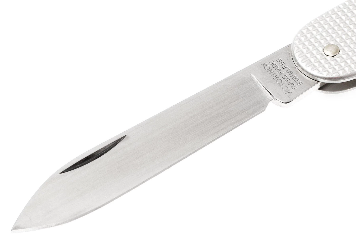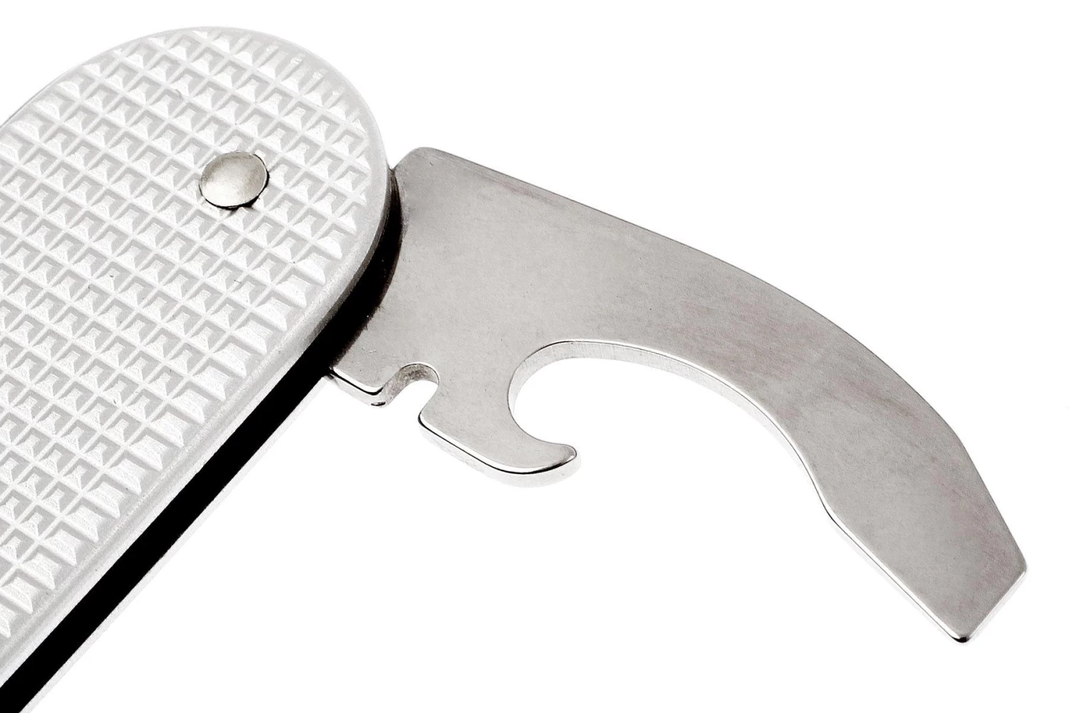 Navaja Victorinox con cachas de alox estriadas (aluminio). Muchas son más ligeras y finas que los cuchillos estándar. Dos piezas plegables con cinco funciones.